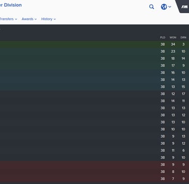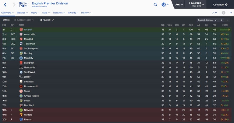 This is my standing in the English Premier Division after using the formation for an entire season. Champions with one loss and a goal difference of 109.
