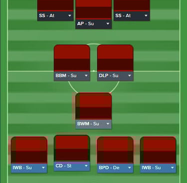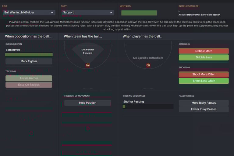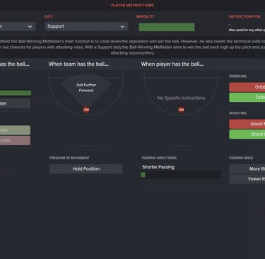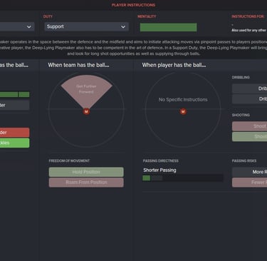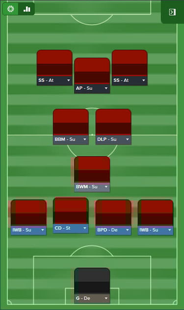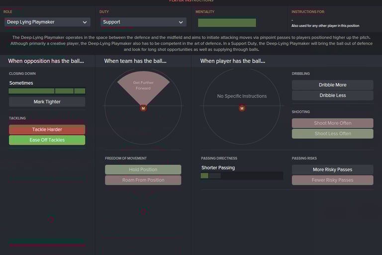 With an active BBM you have four players already dedicated to providing attacks, with the BBM arriving late to keep the ball in the opposition area. Your deep lying playmaker (DLP) will hold his position and bring your BBM or AP into play with simple short passes, leaving a run into the opposition half much later. Which is perfect for a long shot specialist.