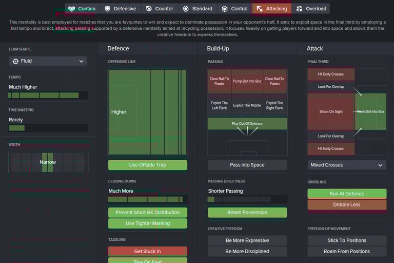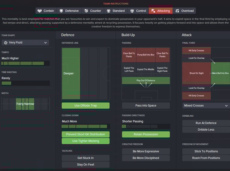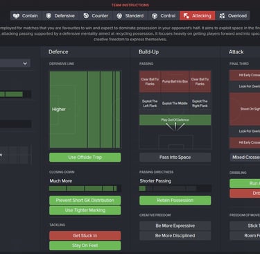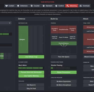 I opted to go for a deeper defensive line so the team can get the ball back in our end and get it forward as quickly as possible by foot. No hoofing the ball and hoping for it to land at the feet of one of my lads. Play out of defense, retain possession and play damn fast football. There's no point in selecting "be more expressive", because they should be anyway with a liberal mix of flair, vision and passing.