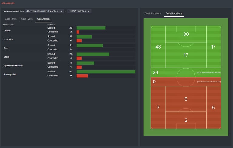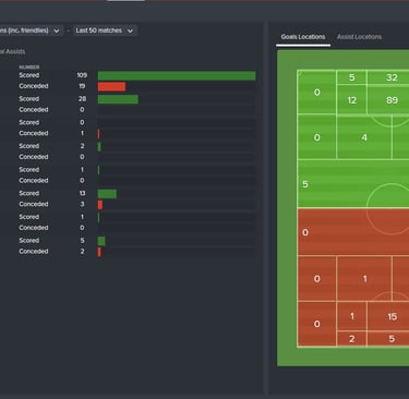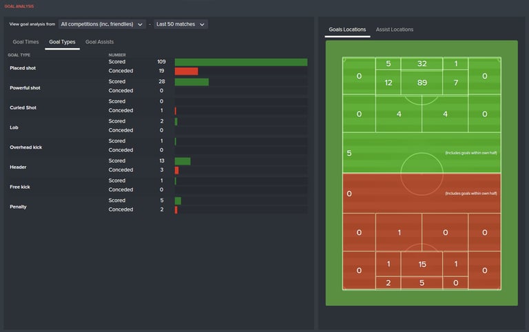 The analysis of my goals from the last 50 games shows a preference of placed shots. Generally my goals from directly in the centre of the park. Though there was the odd wonder goal from outside 30 yards.