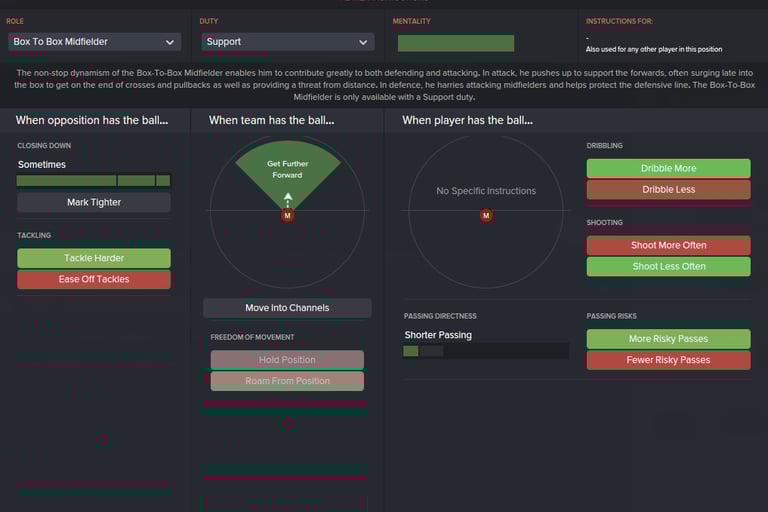 For me, the box to box midfielder is the most important position on the pitch. Your BBM has to have enough pace, stamina, creative and technical attributes to be able to bomb it up and down the pitch for over an hour, mopping up attacks and creating ones, too (that's usually why I like to train an attacking midfielder in that role).
